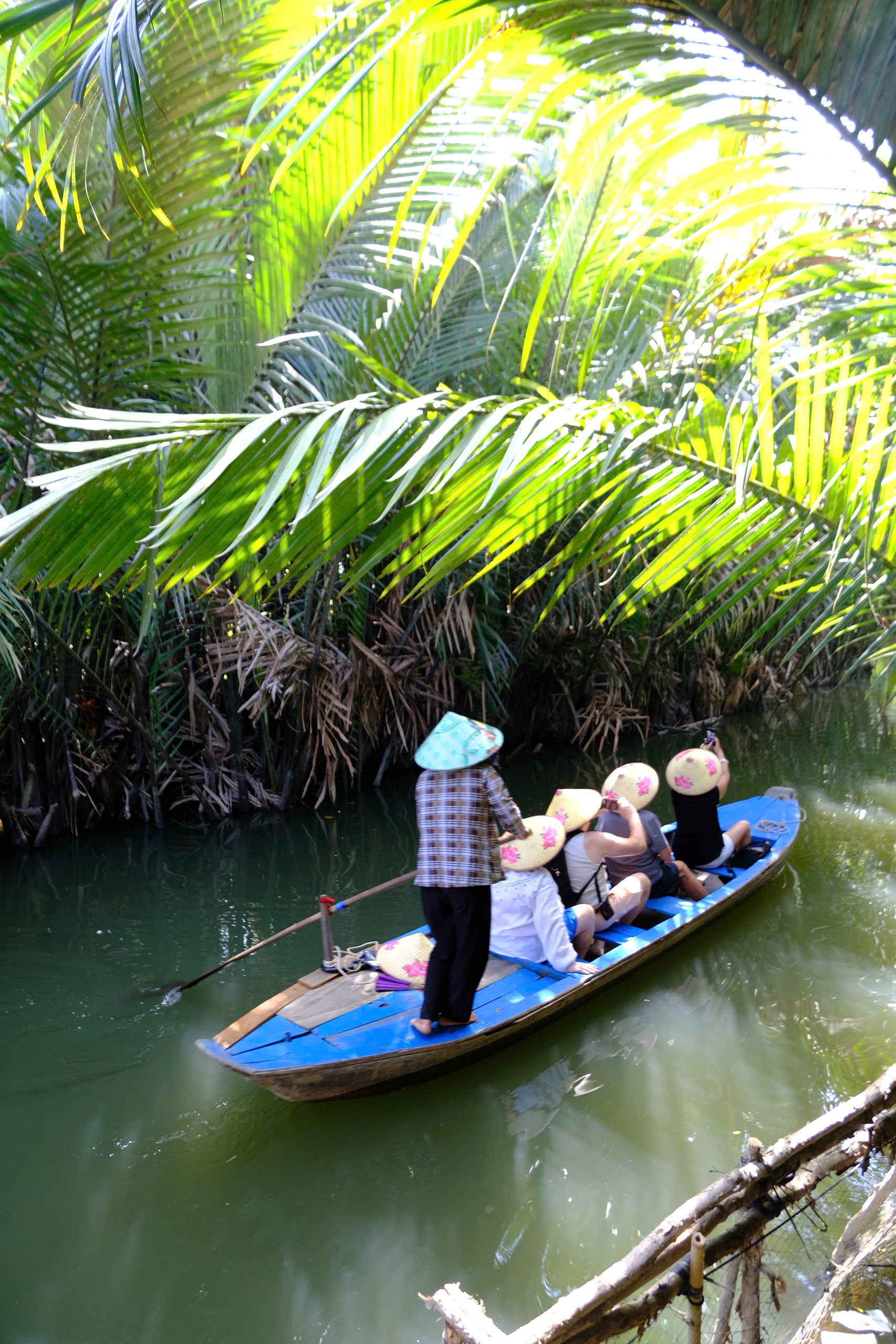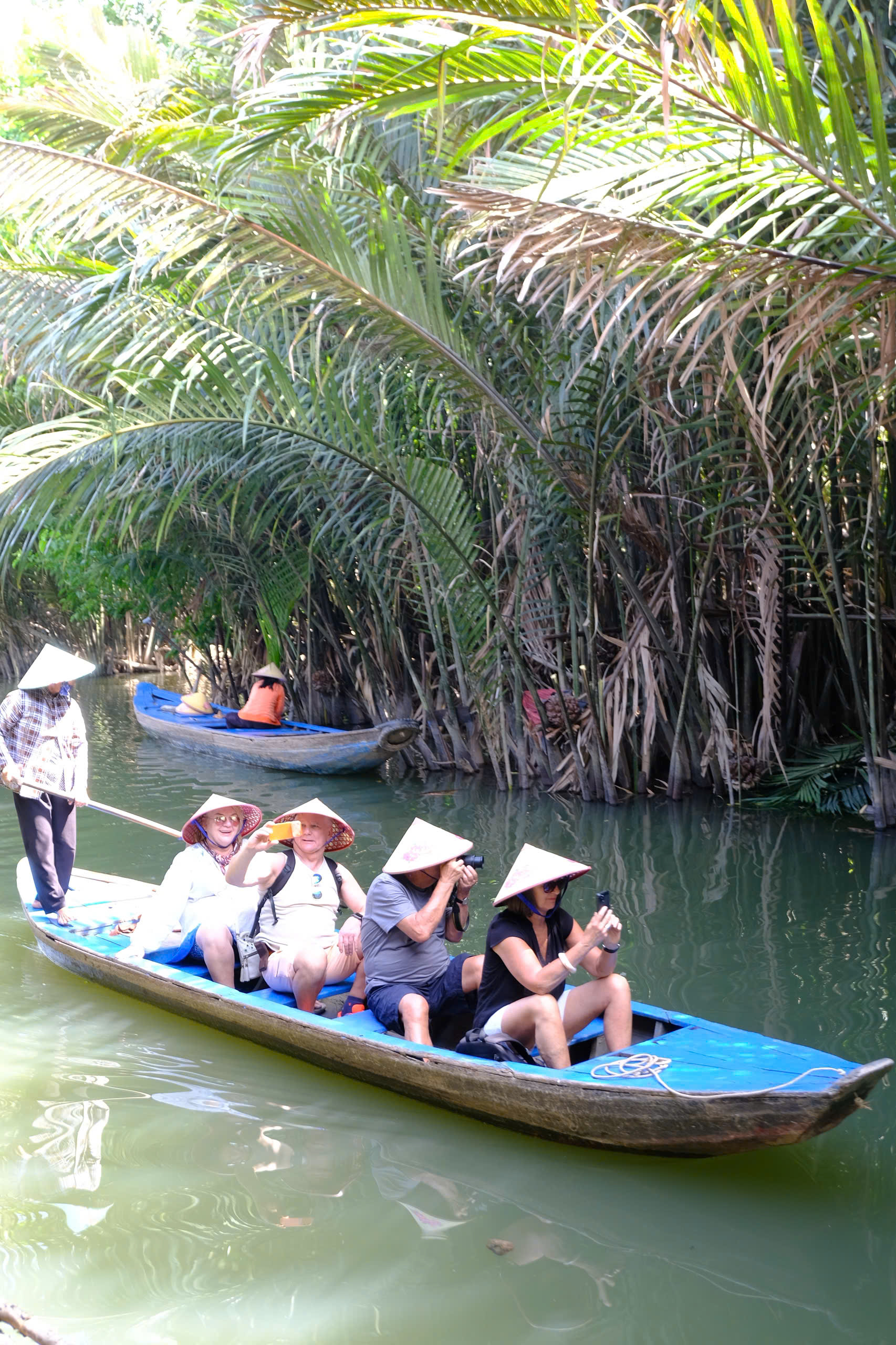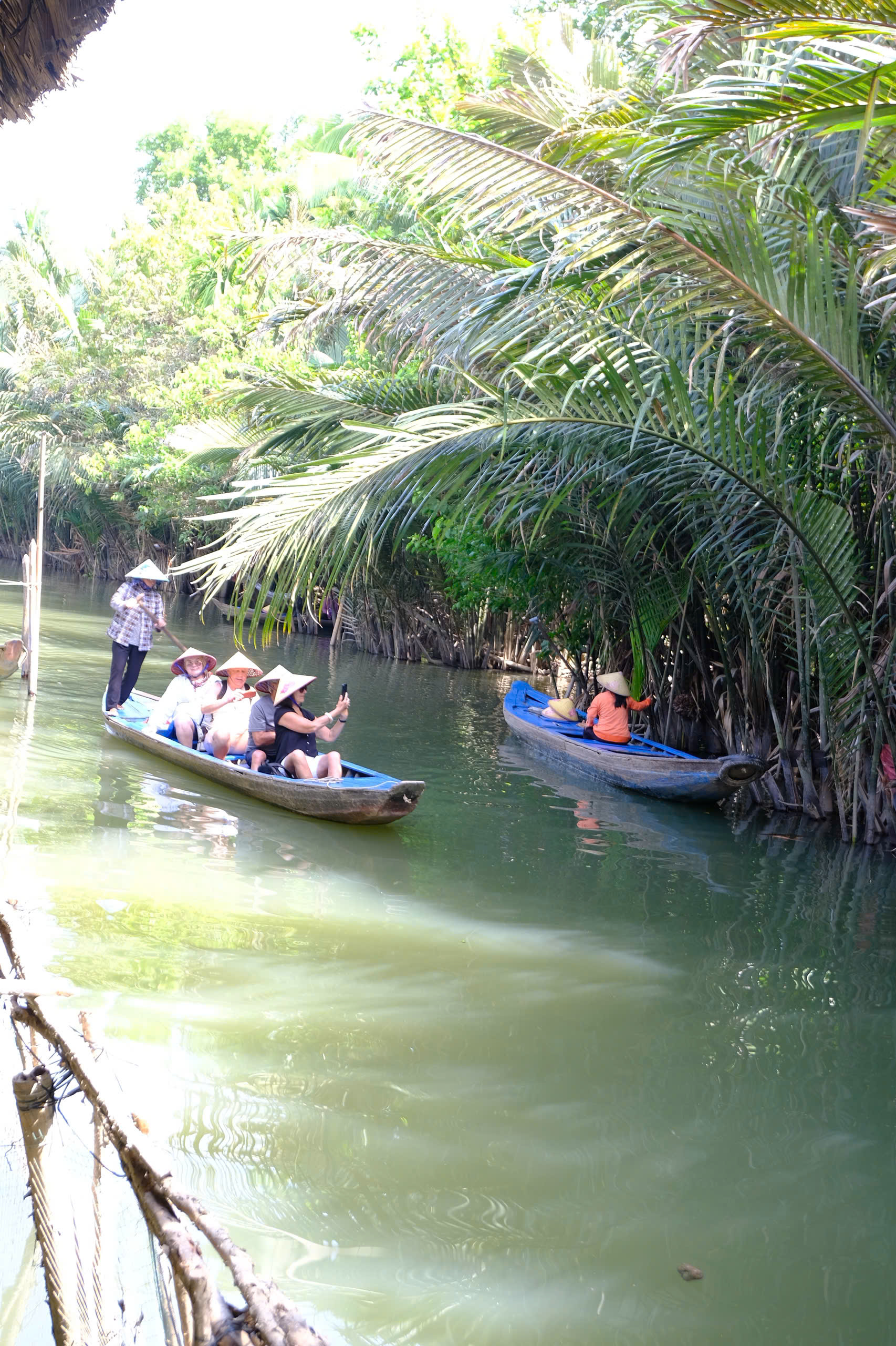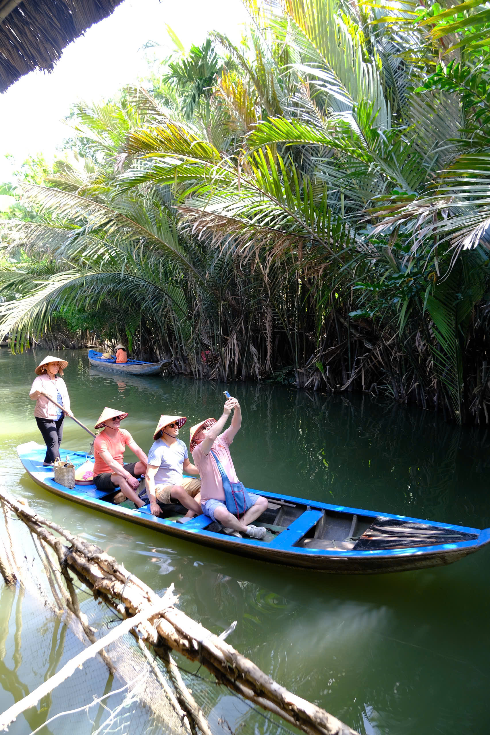 -Đi xuồng ba lá len vào rạch nhỏ dưới hàng dừa nước xanh mát.